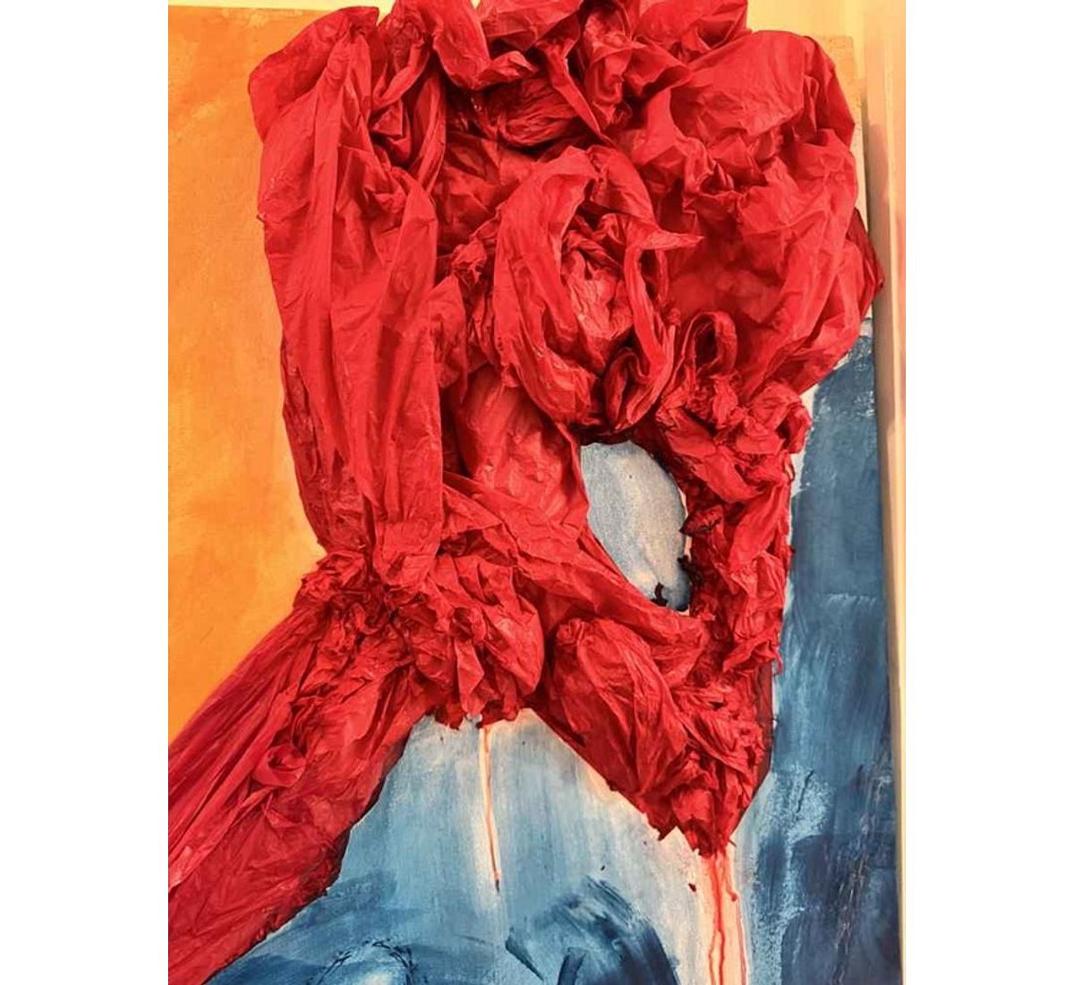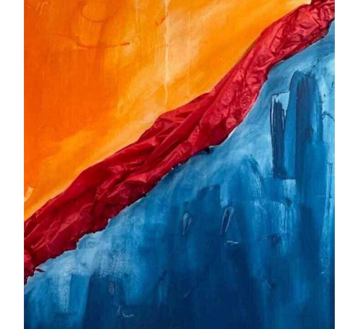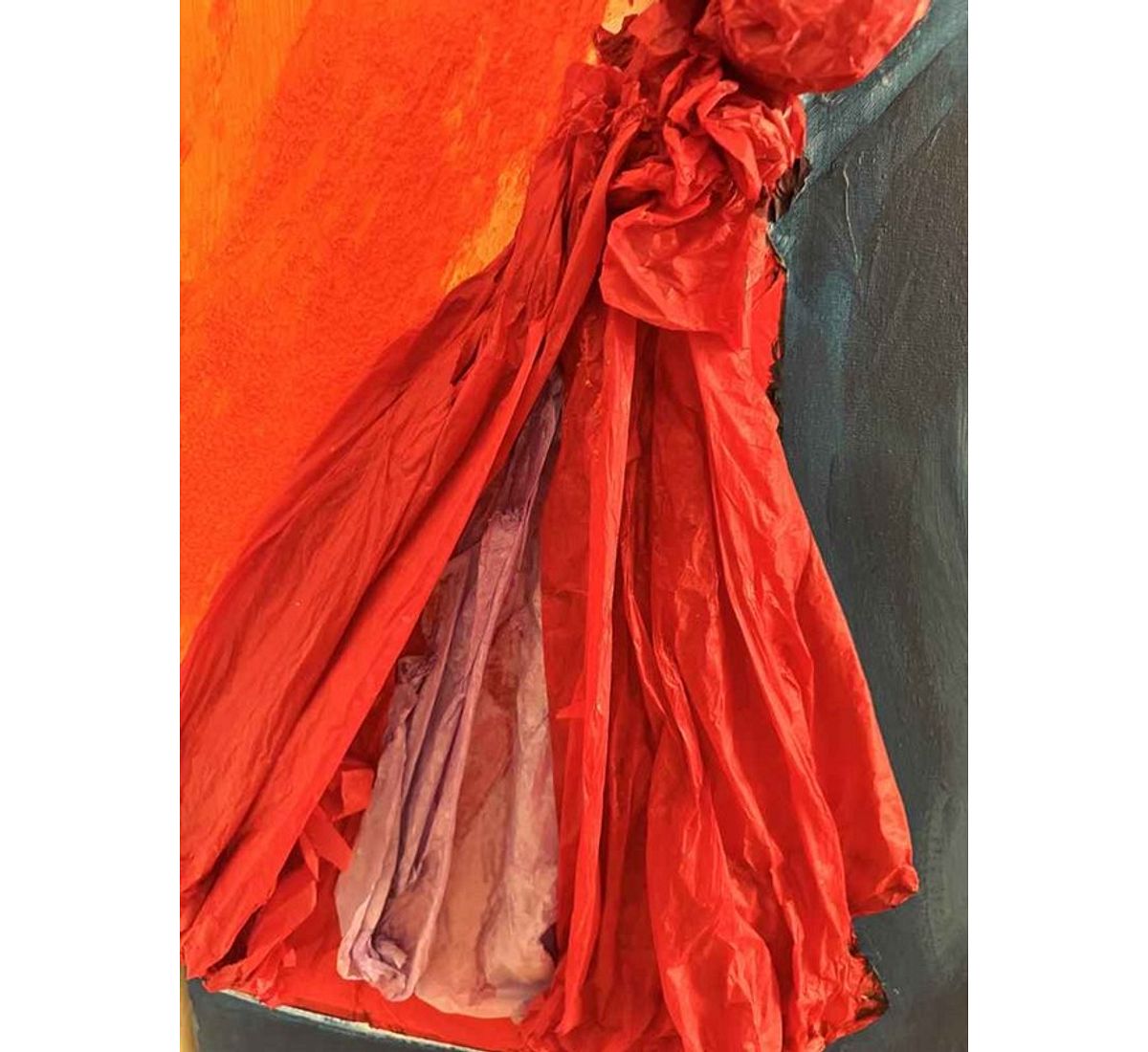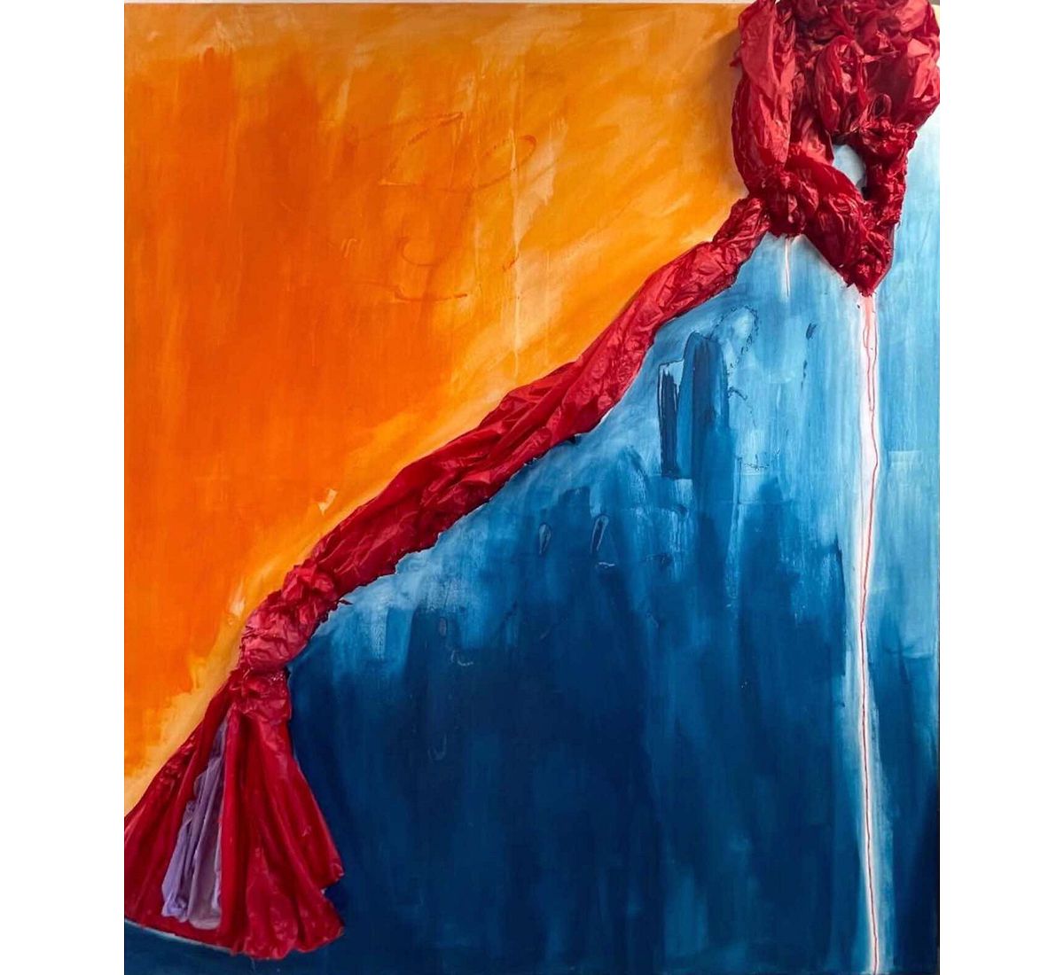 A vivid meeting of orange and blue forms the foundation of this work, where light and depth seem to push against each other. From their intersection, a bold red structure rises across the canvas, textured and gathered like fabric in motion. Its sculptural presence introduces a sense of tension and release, as though something powerful is emerging from within the surface. The colours blend and clash, creating a moment of transition filled with quiet intensity.