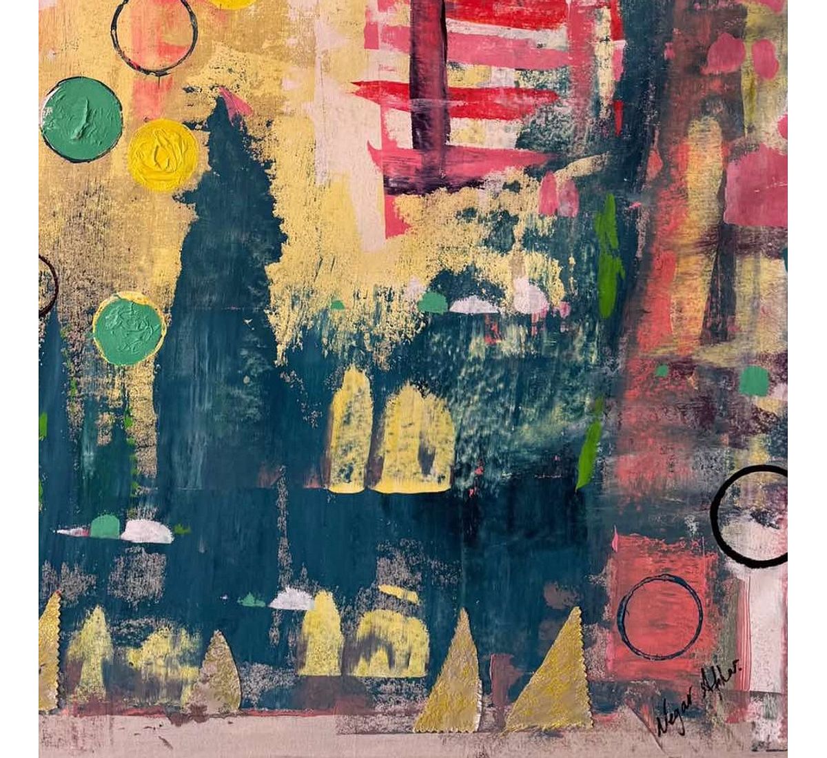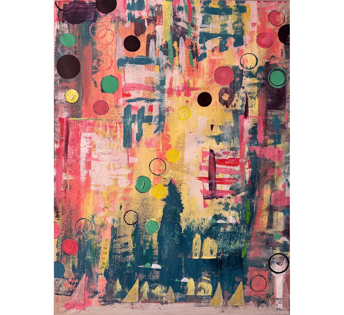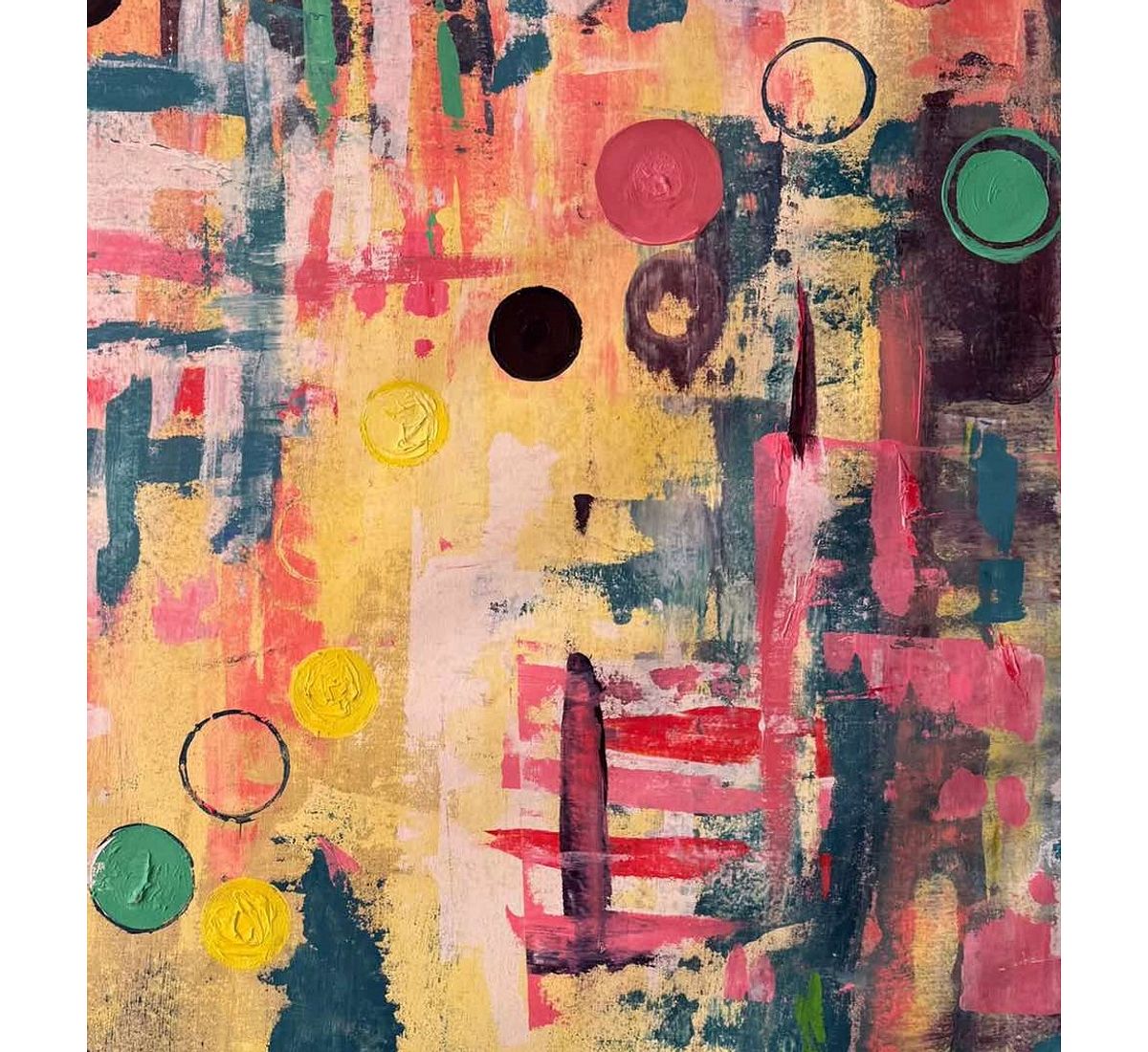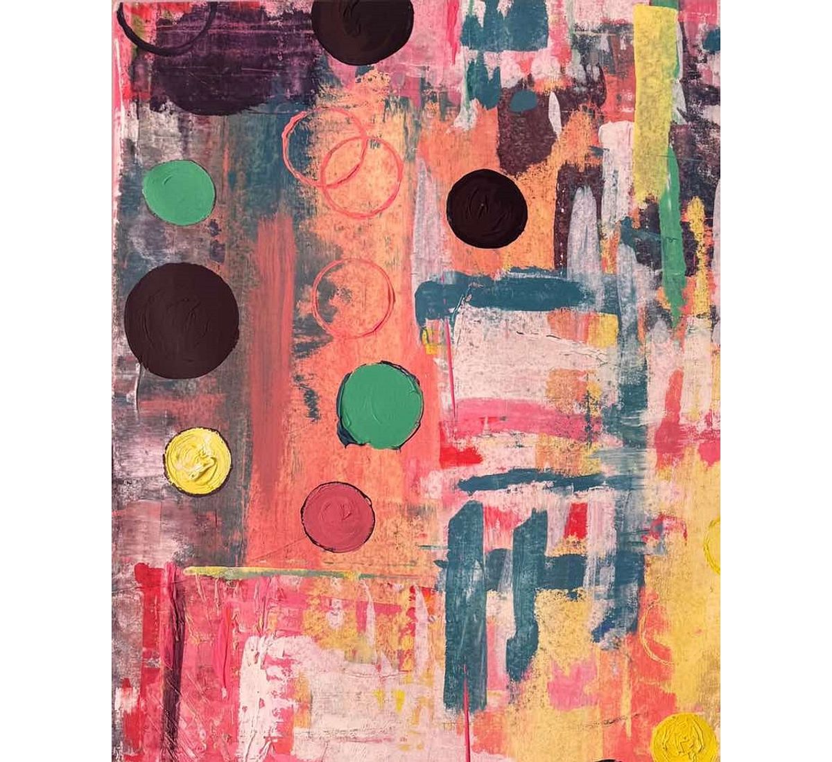 This painting centres on the idea of ambition and perseverance. Layers of colour move across the canvas in soft transitions of yellow, pink, green and blue, creating a sense of movement and change. The circular shapes suggest ongoing cycles of effort, growth and renewal. There is a quiet determination in the composition where bold strokes meet gentler tones, reflecting both the challenges and the calm moments that come with working toward something meaningful.